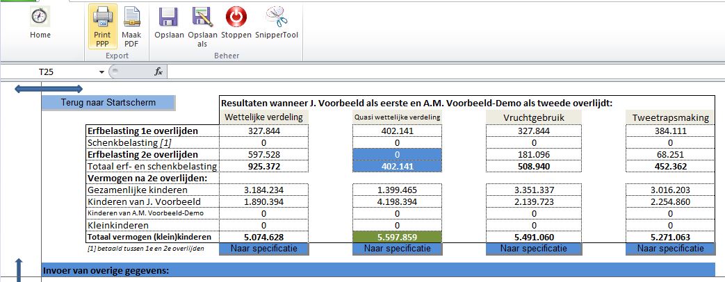 Voorbeeld invoer + (tussen)resultaten Private Estate Planner