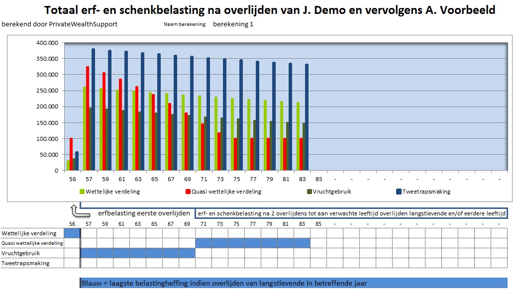 De Private Estate Planner bevat een aantal fraaie grafische dashboards. Dat helpt enorm om uw klant snel de effecten van bepaalde keuzes duidelijk te maken. Maar dat niet alleen, het inzicht aan de hand van grafieken is voor u als adviseur ook zéér prettig en educatief. Hieronder een voorbeeld van een grafiek uit de Private Estate Planner.