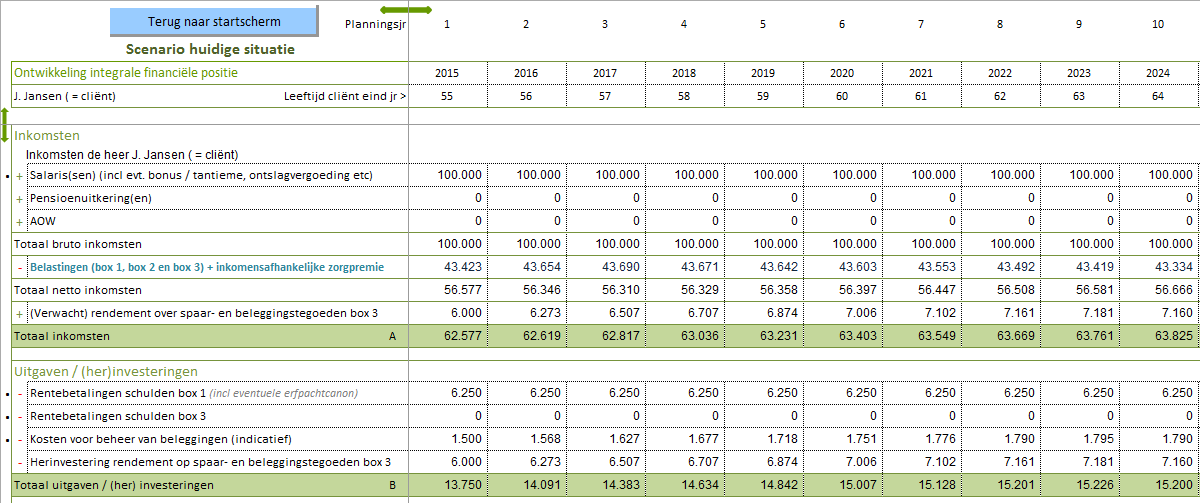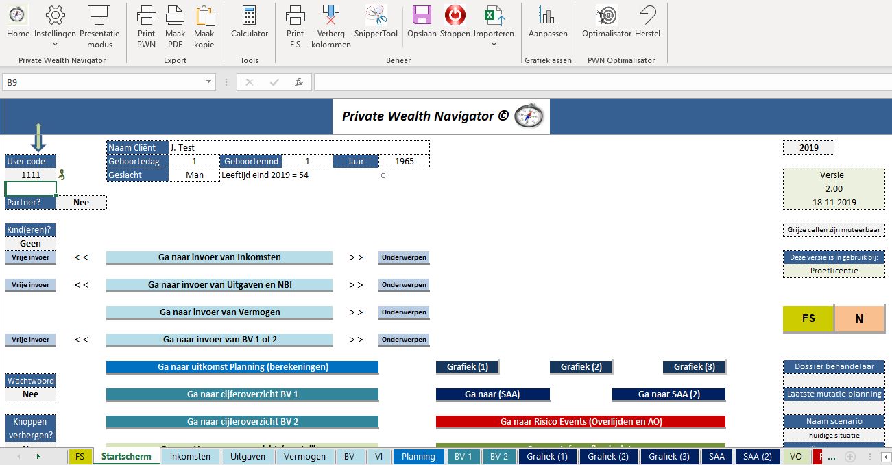 De Private Wealth Navigator © biedt de mogelijkheid om de volledige financiële positie (holistische benadering) van de klant  in beeld te brengen en deze op geavanceerde wijze over een periode van maximaal 50 jaar door te rekenen. Hierdoor ontstaat een gedetailleerd inzicht in de toekomstige cashflow (zowel privé als BV en de correlatie tussen beiden) alsmede de ontwikkeling van het (belegbaar)vermogen. De haalbaarheid van een bepaald gewenst Netto Besteedbaar Inkomen (NBI) en overige wensen en doelstellingen wordt op een inzichtelijke (ook grafische) wijze in beeld gebracht.