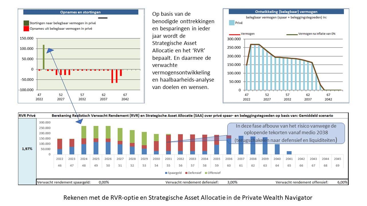 Sinds december 2021 beschikt de Private Wealth Navigator over de geavanceerde ‘RVR-methode’. Met deze methode wordt geheel automatisch een bij de financiële positie van de klant passend beleggingsprofiel berekend (Strategische Asset Allocatie). En op basis hiervan wordt een Realistisch Verwacht Rendement (RVR) berekend.